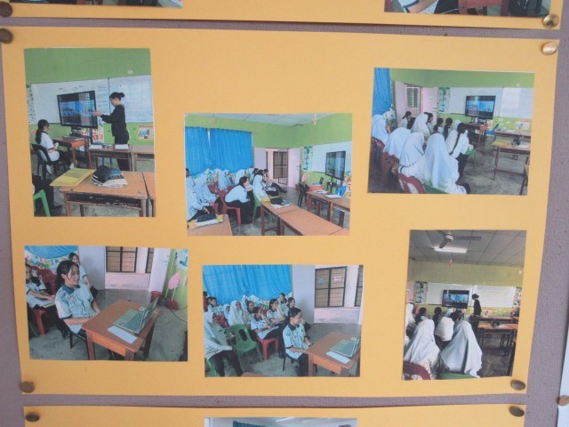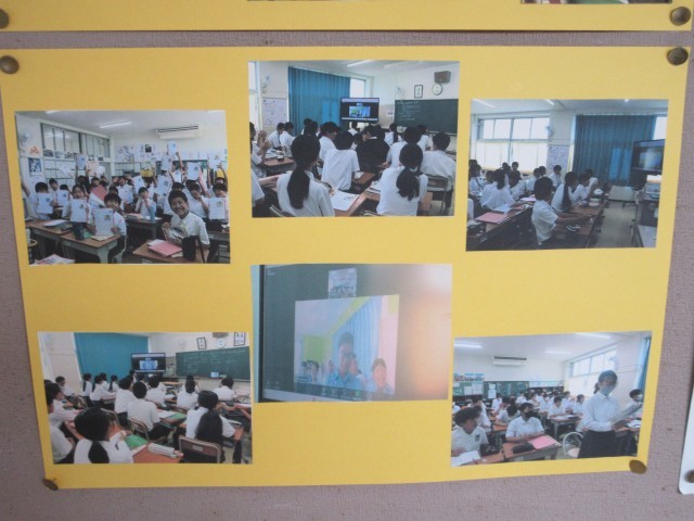 先日の英語の授業でのマレーシアの子どもたちとの交流会の様子の写真が掲示されています。同年代の海外の子どもたちと交流し、異文化に触れるよい機会になったと思います。