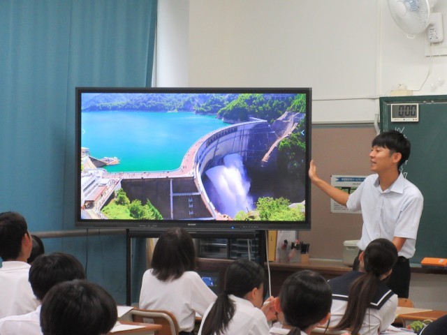 社会科の授業では、「北陸・東海の農業にはどのような特色があるのか」をテーマに学びました。電子黒板を使ってダムの説明がされましたが、富山のダムでできた電力が関西に送られていることを知り、生徒たちは驚いていました。よい学びになっていました。