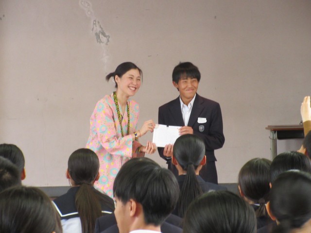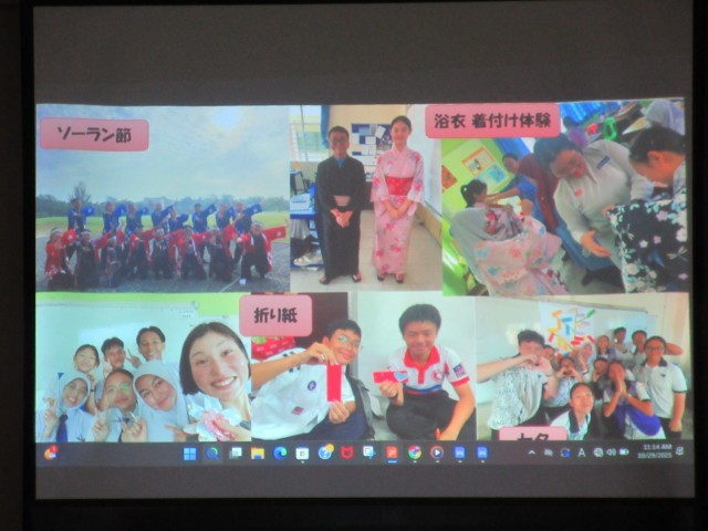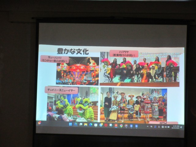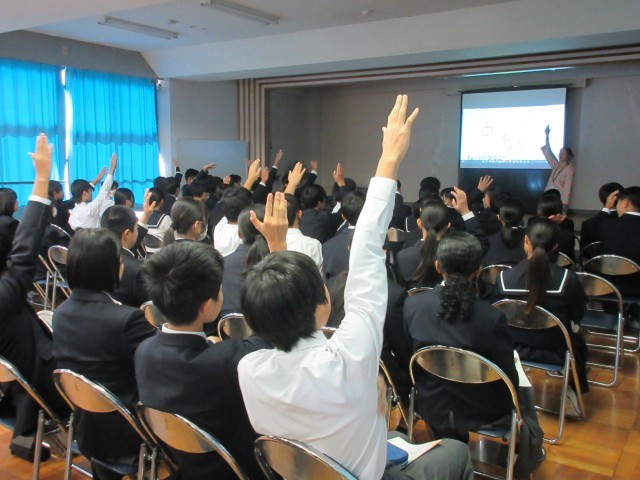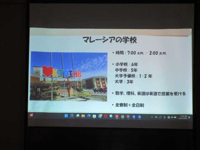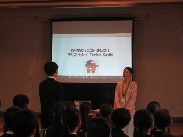 本日、マレーシアの学校に携わられていた山本様による講演が開かれました。マレーシアクイズを行う中で、生徒たちはマレーシアのことを学んでいきました。マレーシアは、マレー系69%、中華系23%、インド系7%、少数民族1%の多民族国家です。多民族国家ということで、さまざまな料理が食べられたり、豊かな文化を経験したりできるそうです。また、マレーシアの学校は、日本の学校とさまざまな点で異なっていることを知り、生徒たちは驚きの声をあげていました。最後に、お礼の言葉を伝えるとともに、マレーシアの生徒からの手紙を代表者が受け取りました。生徒たちは、大変嬉しそうでした。