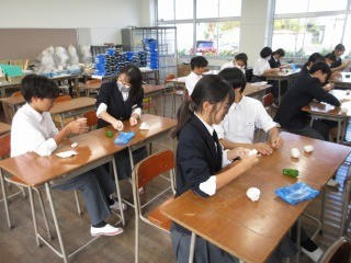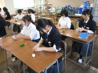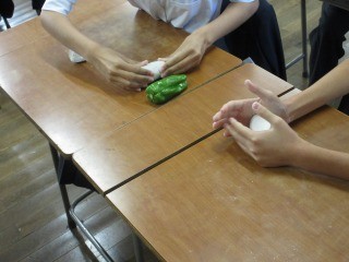 1年生の美術の授業では、「そのものらしさを形にして」という主題で、ピーマンの模刻を行いました。まず粘土を扱いやすいように整えて、ピーマンの形を大まかに捉えました。本物にそっくりのような模刻の制作に取り組んでいます。楽しそうに工夫を凝らしています。