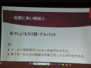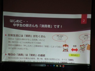 3年生では、常滑市経済振興課の方を講師に招き、「かしこい消費者のススメ」というテーマの消費生活講座を受講しました。契約に伴うトラブルや詐欺の被害に会わないように消費者として大切な学習をしました。説明やクイズに加え、役割演技もあり、理解を深めることができました。経済振興課の講師の皆様、ありがとうございました。