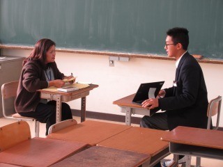 3年生の英語の授業では、ネイティブスピーカーのALTを相手にスピーキングテストを行いました。日本の見所等について、調べたことをShow&Tellの形で発表しています。1対1でも堂々と英語で話すことができています。