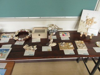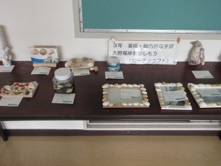 3年生の美術作品は、以前3年生が大野海岸清掃に出かけたときに、砂浜で拾ってきた貝殻を使って、ビーチコミングに取り組んだ作品です。地域素材を使って、美術と総合的な学習の時間との横断的な学習を進めてきました。傑作がいっぱいです。