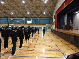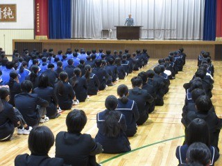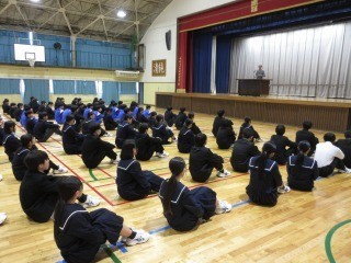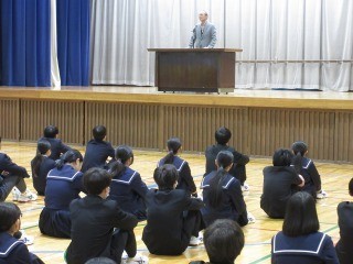 朝会では、本校の学校運営協議会会長の権田様をお招きして、全校生徒に講話をしていただきました。ご自身も青海中の卒業生でいらっしゃり、大先輩として在校生に心のこもったメッセージをお話くださいました。防災の対応のこと、自助、共助のことなどを分かりやすくお話をしてくださいました。最後は、やなせたかしさんの詩を紹介してくださいました。いつもありがとうございます。