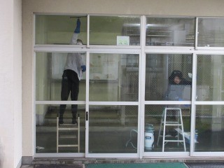 先日、業者による窓ガラス清掃が行われ、本館や南館の高いところがきれいになりました。昨日は本日は、本校のスタッフが、1階の手が届くところのガラス清掃をしました。働き者のスタッフばかりです。生徒たちができないところを補い、環境整備に心がけています。いい環境はいい心を育むと考え、クリーンな青海中づくりに努めています。