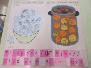 2月26日(金)に、給食委員会では、市の栄養教諭を迎え、給食に感謝する会を行いました。