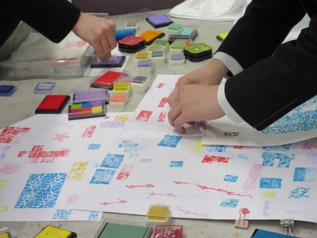美術の授業では、ゴム版を削って連続もようをつくりました。子どもたちは、黙々と削り進め、素敵な作品をつくっていました。ゴム版ができたら、試し押しをしました。押された画用紙を見ると、さまざまな模様がありました。