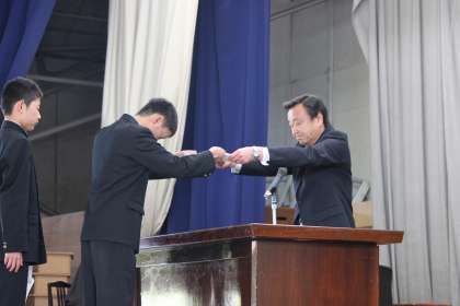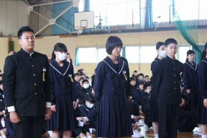 本日の朝会で、三役の任命式が行われました。三役で呼ばれた生徒は大きな声で立派に返事をしていました。学年をひっぱるリーダーとして頼もしく感じました。これから半期、学年をひっぱっていって欲しいと思います。また、生徒会執行部から、校歌を大切にしていこうという話がありました。青海中生として校歌を歌えるのもあと一年です。青海中生としての誇りをもち、校歌を大切に歌っていきましょう。