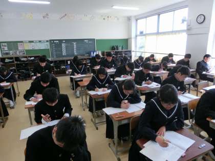本日、全国学力・学習状況調査をおこないました。国語A・国語B・数学A・数学Bと順番にテストを行いました。生徒は、連日のテストにもかかわらず、一生懸命に問題に取り組んでいました。
