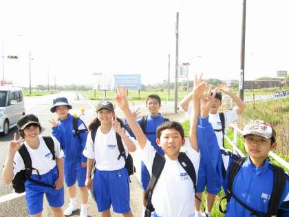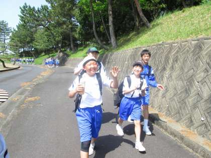 予定通り8時30分に学校をスタートしました。ある班は歌を歌いながら、ある班はしりとりをしながらなど、元気に楽しく歩く姿が見られました。ほとんど弱音を吐かず、たくましく歩く姿に先生達も驚くばかりでした。班で協力し、励まし合いながら参加者全員が完歩することができ、1年生みんなで大きな充実感を得ることができました。何よりも、参加者全員が、大きなトラブルやケガもなく、無事に終えることができたことが最もよかったですね。1年生のみなさん、本当にお疲れ様でした。