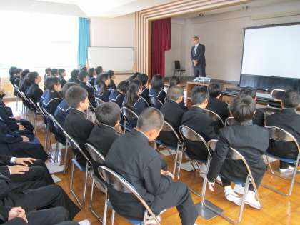 1時間目の学活にて、半田特別支援学校との交流についてのオリエンテーションを行いました。交流の目的や活動内容、注意すべき点などについて、スライドを見てイメージをふくらませながら知ることができました。