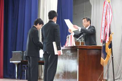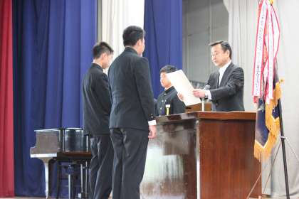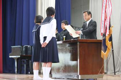 本日の朝会で、表彰が行われました。テニス部が市内大会で、男子は1位・2位、女子は3位という好成績を残しました。日頃の練習の成果がでて、本当に良かったです。選手のみなさん、本当におめでとうございます。なお、優勝した片山・村上ペアは県大会へ進みます!頑張って下さい。