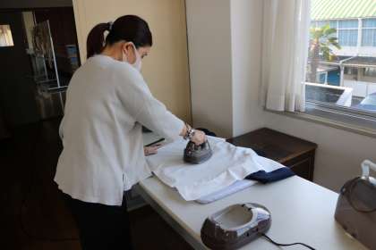 本日15時より、PTA生活安全部の皆様に、「PTA制服リユース活動」の仕分け作業をしていただきました。小さなほこりを取り除き、アイロンがけをして、サイズ別に仕分けをしていただきました。
