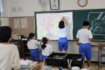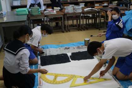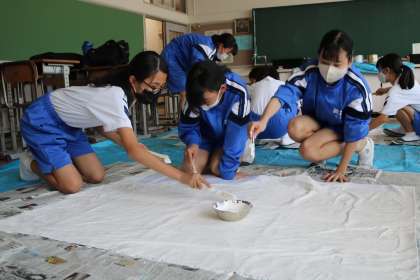 体育祭に向けて学級旗の製作をしています。今年は、サイズを縮小して製作をしていますが、絵の好きな生徒たちががんばっています。