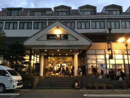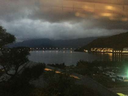 ホテル湖龍に到着しました。窓から河口湖が見渡せるホテルです。明日は、河口湖に映る富士山が見えるといいですね。