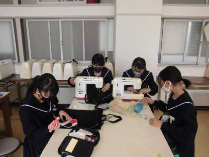 1年生の家庭科では、エコバックを作っています。今日は、「ポケットを縫い付ける」「両脇を縫う」の2つに取り組んでいました。ミシンも上手に使っていました。