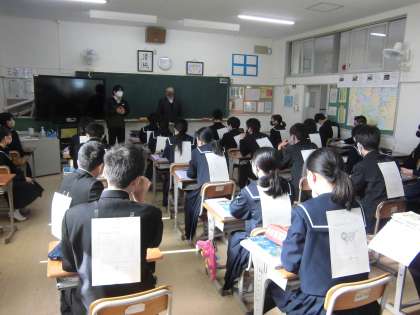 12月10日 授業の様子(3A 英語) 公開日 2020/12/10 更新日 2020/12/10 お知らせ 生徒の背中に貼ってある紙には、動物の絵が描いてあります。これは、前の席の人が描いたもので、貼られた本人は、どんな動物が描いてあるか知りません。その動物が何かを友達と英語で会話しながら当てていく活動です。楽しみながら英会話の学習をすることができました。 いいね(0)