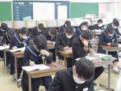 3年生は、私立・専修学校の入試のため、半数の生徒のみ登校しました。今日は2クラス合同で学習しました。いつもとは違う教室の雰囲気でしたが、みな真剣に取り組んでいました。