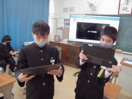 ネットワークの工事が完了したので、ようやく一人一台情報端末を使うことができるようになりました。1年生は、はじめてChromebookを受け取りましたが、すぐに操作を覚え、撮影した画像を教師に送信することができました。