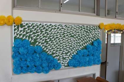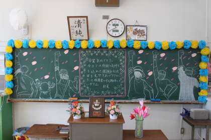教室に入ると、素敵な黒板の絵や飾り付けがしてありました。見ていると心が暖かくなりました。