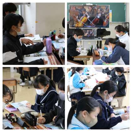 3月9日 授業の様子(1B 音楽) 公開日 2021/03/09 更新日 2021/03/09 お知らせ ブルタバの鑑賞をしました。楽器の音色に耳を澄ませ聴き比べていました。違いに気づいたかな。 いいね(0)