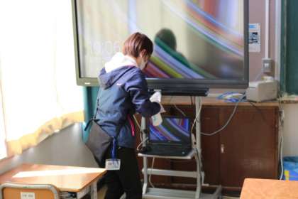 愛知県が出していた「厳重警戒宣言」は、21日で解除されましたが、校内の消毒作業は、引き続き行っています。スクールサポートスタッフが、感染予防でドアノブや流し、電子黒板、校内電話などを消毒しています。