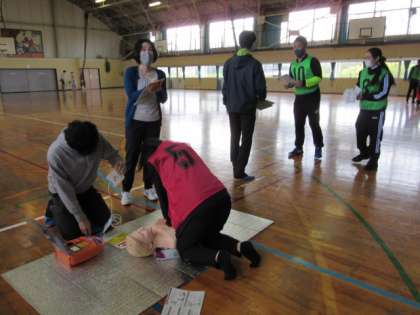 4月12日 職員救急法訓練2 公開日 2021/04/12 更新日 2021/04/12 校長より 心肺蘇生法を教えていただいた後は、シミュレーション訓練です。実際に人が倒れたことを想定し、アクションカードの指示に従って動いていきます。「もしも」の時に動けるように真剣に取り組みました。 常滑市消防本部の皆さん、ありがとうございました。 いいね(0)