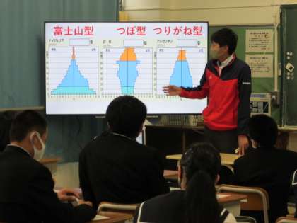 5月7日 社会の授業 公開日 2021/05/07 更新日 2021/05/07 2年生より 2年生の社会の授業では、富士山型・つぼ型・つりがね型の人口ピラミッドを見て、3つの国が抱えている人口の問題は何かを考えていました。毎時間用意されているプリントに書き込んでいきます。 いいね(0)