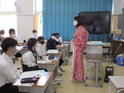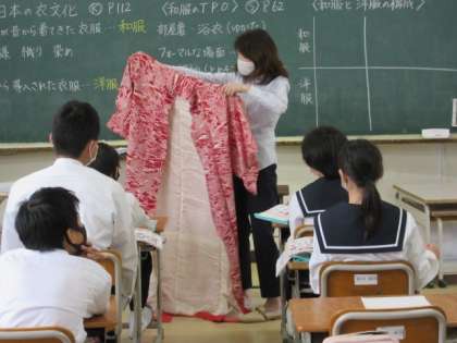 5月18日 着物を知る 公開日 2021/05/18 更新日 2021/05/18 1年生より 家庭科では、今年から「着物の文化」について学びます。実際に着物を目にし、着物のつくりや着方を知りました。布を長方形にし縫い合わさっていること、誰にでも合うように丈が長いことなど、着物のよさにふれました。着物の文化を知ることは、日本文化を知ることにもつながります。生徒たちも思わず着たくなったことでしょう。 いいね(0)