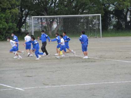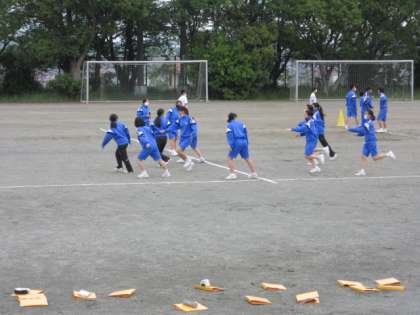 雨が上がり運動場が乾いてきました。リレーで20mのテークオーバーゾーンをうまく使うための練習です。バトンをもらう生徒は、マークをつけるという本格的な練習です。