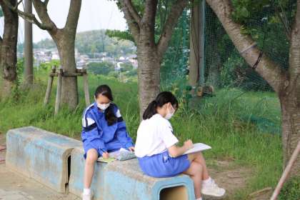 屋外に出てスケッチをしていました。青海中のどんな風景を描いたのでしょうか。