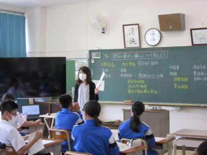 2年生の家庭科では、食品を選択する場合に気をつけなければならないことを学んでいました。何でもかんでも欲しい物を買うのではなく、購入する前に気をつけることは何かを考えました。思わず見るのを忘れて「しまった。」とならないようにしたいものです。どうやら、宿題も出たようで。きちんと家で見つけて、提出できるといいですね。