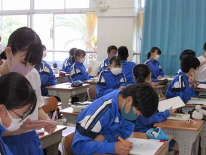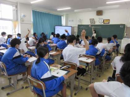 3年生の数学の授業です。「発表してくれる人いますか」と言うと、何人もの生徒が手を挙げてくれています。見ていて気持ちがいいです。さすが3年生だなあと思います。