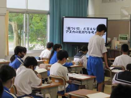 教育実習生も残り3日となりました。やっと慣れてきたところで、残念ではありますが。今日は、1年生の教室で道徳の授業が行われました。落ち着いて、子どもたちの考えをうまく引き出していました。