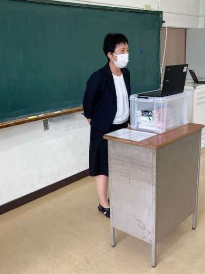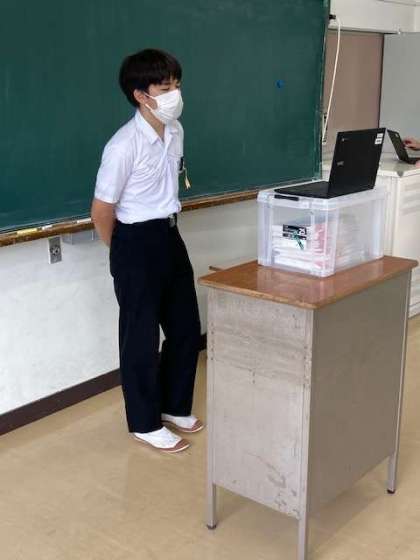 生徒会の司会とあいさつで始まり、校長先生から2つのお話がありました。一つは、狭い道を歩いていた生徒が軽トラに気付き、道路の端によって軽トラを通してあげ、軽トラのおじいさんからお礼を言われたお話でした。二つめは、6月23日で中村先生が退職し、6月24日から堀江先生がE組の担任になるお話でした。