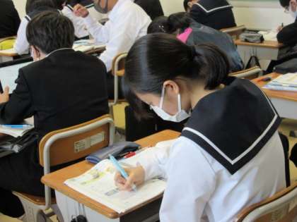 3年生の英語の授業です。インドの紹介文を聞き取っています。他国の様子が分かると同時に英語も分かるので一石二鳥です。