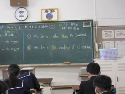 11月10日 どっちが大きい? 公開日 2021/11/10 更新日 2021/11/10 2年生より 2年生の英語の授業です。物や人を比較する文を考えます。考える文は、ゴジラと自由の女神では、どちらが大きいかです。さっそく、ゴジラと自由の女神の体長を調べます。すると、ゴジラの方が若干大きいことが分かりました。このことを使って英文にします。比較する物が身近であったり、興味深い物であったりすると楽しく学習できます。 いいね(0)