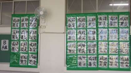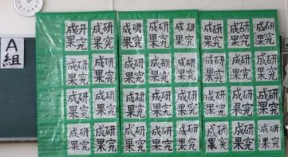 1年生の学年室には、国語の授業で書いた「研究成果」が展示されています。A組とB組に分けて展示されていますので、懇談会の折にご覧ください。