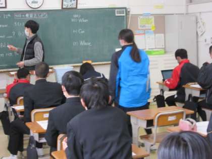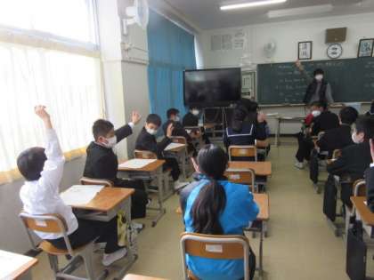 1年生の英語の授業です。当てられたら、きちんと立って答えていました。さすがです。復習をしていたら、朝食の話題になりました。ご飯かパンかという質問には、どちらも半々くらいに分かれました。しっかり朝食をとっていることに安心しました。何があっても食は外せません。