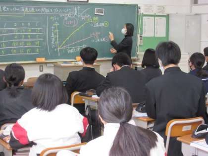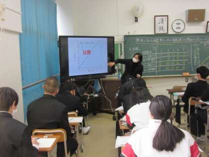 2年生の理科の授業です。結果をグラフにしてみていきます。比例のグラフになりました。グラフにすることで、関係性が分かってきますね。