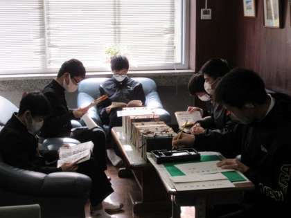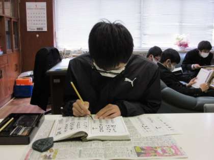 3年生A組の様子です。「日進月歩」「七転八起」「叶」などの言葉を順番に記していきました。友達と同じ言葉を選んでも、選んだ理由が違っています。それぞれの座右の銘になっていけばよいのです。生徒たちの考えを聞いていると「未来は明るい」と思いました。