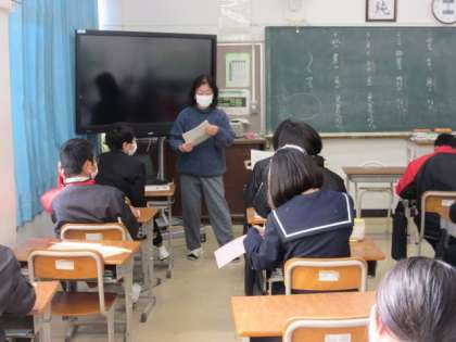 1年生の国語の授業です。本時の目標は補助の関係について理解します。いくつか例題を解き、補助の部はどこかを理解していきます。1枚プリントが終わったら、新たなプリントが配られました。学習が定着していきます。