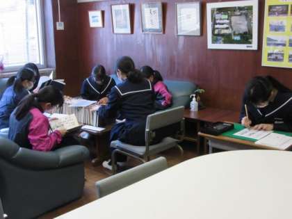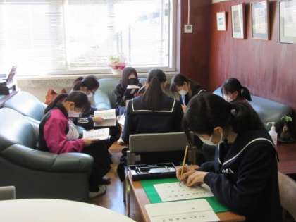 3年生の誓詞書き後半の部が始まりました。A組の様子です。初志貫徹、起死回生、温故知新、感謝、NEXT、前向き、七転八起という言葉を記帳しました。写真は練習の様子と先輩方の誓詞を見ているところです。どの生徒も心を込めて書いてくれました。