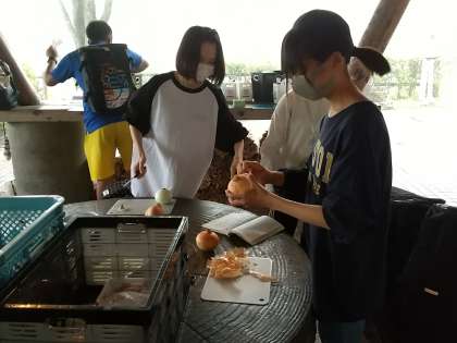 材料を切る係、かまど係と分担して、カレーライスづくりがスタートしました。