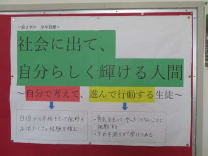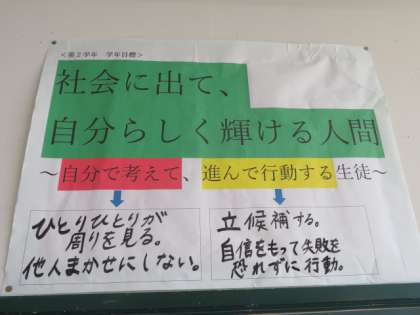 学年目標を生かして 公開日 2022/10/04 更新日 2022/10/04 2年生より 2年生では、学年目標を生かして、2学期にどのようなことをするのか具体的な行動を考えました。大きく教室掲示してあり、大きく生徒が成長することを願っています。 いいね(0)