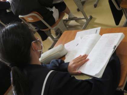 見本となる勉強のやり方 公開日 2022/11/25 更新日 2022/11/25 1年生より 数学の授業では、リープのよいやり方を紹介していました。自分のリープと見比べながら、生徒は聞いていました。また、友達の画像が写し出されると、真剣な表情で見ていました。 いいね(0)