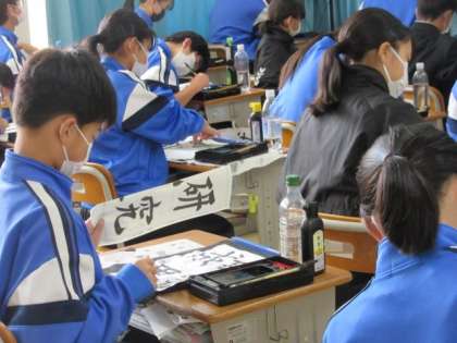 11月28日 毛筆 公開日 2022/11/28 更新日 2022/11/28 1年生より 1年生の国語は毛筆(研究成果)の練習です。手本を見てしっかり書いていました。自分の名前を入れたら完成です。 いいね(0)