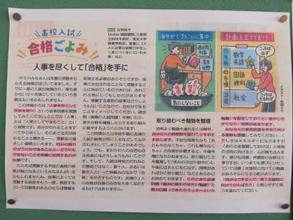 公立一般まで残り半月2 公開日 2023/02/06 更新日 2023/02/06 3年生より 入試に向けて、卒業に向けて、さまざまな掲示が貼られています。生徒の心にも届いていると思います。 いいね(0)