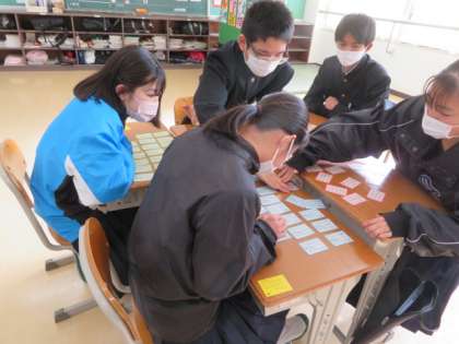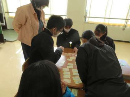 クラスメイトとよみあげられた百人一首を取り合いました。すぐに反応してとる姿が、素晴らしかったです。
