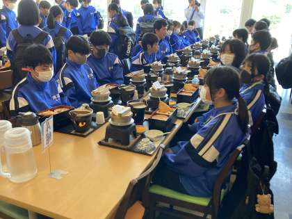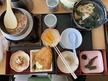 伊豆フルーツパークに予定よりも早く着き、桜エビの入った釜飯を堪能しました。エビのアレルギーのある子は代用の食材となりました。